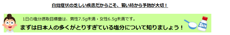 また糖尿病がある場合は、血圧が正常の場合でも脳卒中や心筋梗塞、腎不全になりやすいことがわかっています(高血圧を合併しているとリスクはさらに高くなります)。そのためこれらを予防し、重症化しないようにするため、糖尿病がある場合は、より厳格に上記の基準内に減塩しましょう。