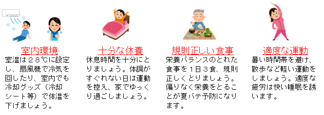 体温調節機能と睡眠不足からくるエネルギー不足により「夏バテ」の症状が出てくると考えられています。