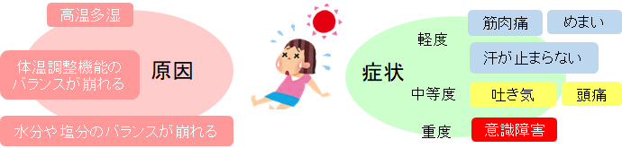 熱中症は体温の上昇や脱水状態が原因で起こります。体は体温を一定に調整する働きがありますが、夏場に体温が上がり調整機能のバランスが崩れるとどんどん体に熱が溜まってきます。